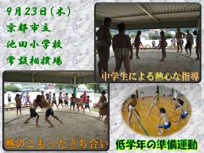 9月23日(木)は,池田小学校と合同稽古をしました。池田小学校は,市内屈指の強豪校です。どの相撲大会でも,池田小学校の子どもたちは,大活躍をしています。校内にある立派な土俵をお借りして練習をしました。