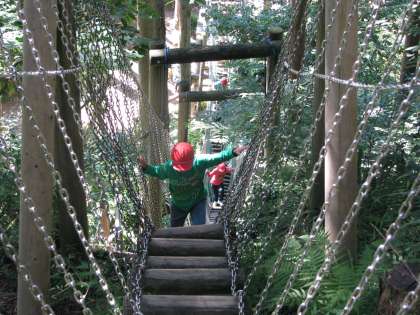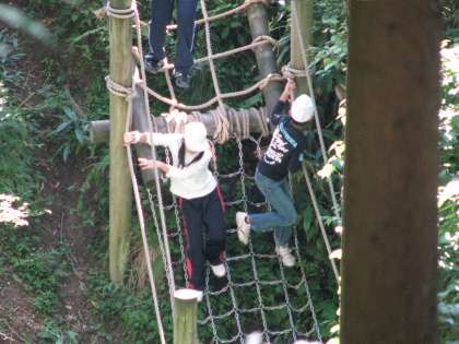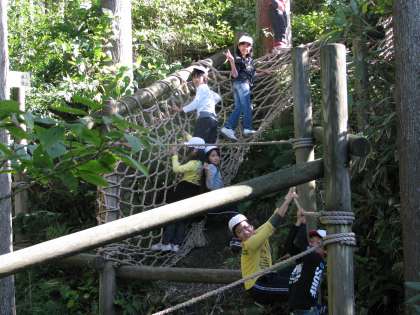 午後の活動の一つが『冒険の森 アスレチック』に挑戦です。山の家の館内には冒険の森があります。その冒険の森全体がアスレチックになっています。子どもたちは元気に,そして果敢にアスレチックに挑戦していました。