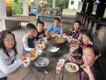 できました!美味しいカレーライスを頂きます。心配した「かたいジャガイモカレー」も「シャブシャブカレー」もありません。どこの班も美味しかったようです。ご飯についても,多少おこげのある班もありましたが,みんな上手く炊けたようです。よかったです。