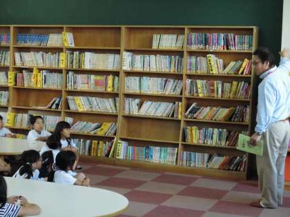 学校司書の佐藤先生に学校図書館の使い方を