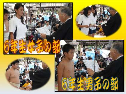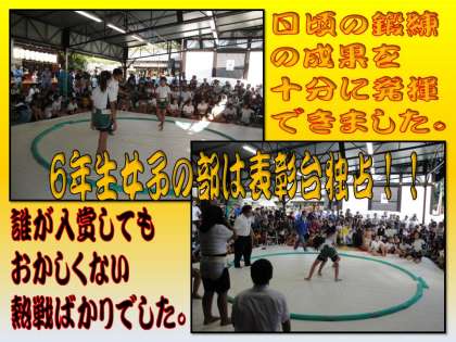 6年生女子の部は,本校児童が表彰台を独占しました。優勝者のY.Eさんは,終始安定した相撲で3連覇を果たしました。高学年女子になると,参加者が少ないのですが,本校は相撲に親しむ女子が多いのが特徴です。実力は拮抗しており,誰が勝ってもおかしくない好取組が多かったといえるでしょう。