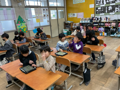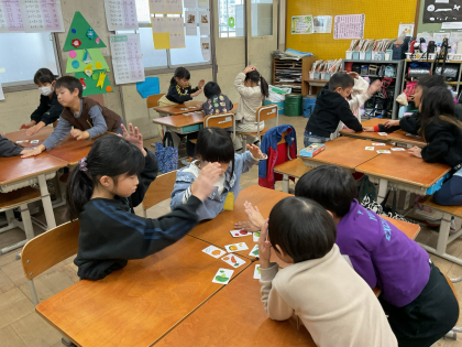 野菜のいい方を学習して、今日はペアで聞こえてきた英語を順番に並べたり、班の友達とポインティングゲームをしたりしました。