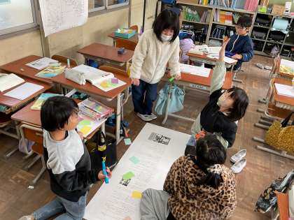 グループで協力して、登場人物の「ぼく」の推理について考えています。