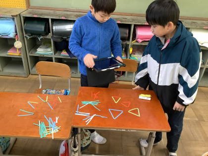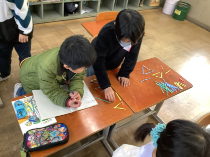 三角形を作ってみて、特徴を見つけて仲間分けをしました。