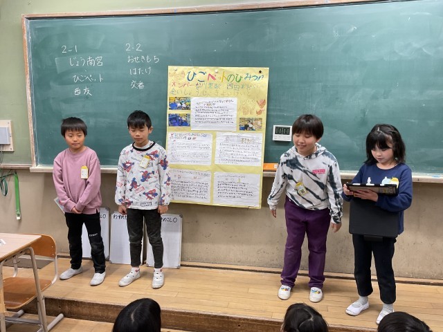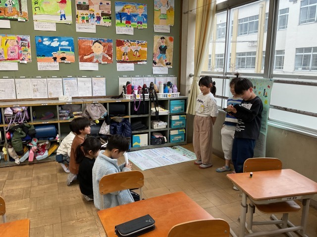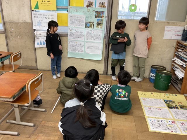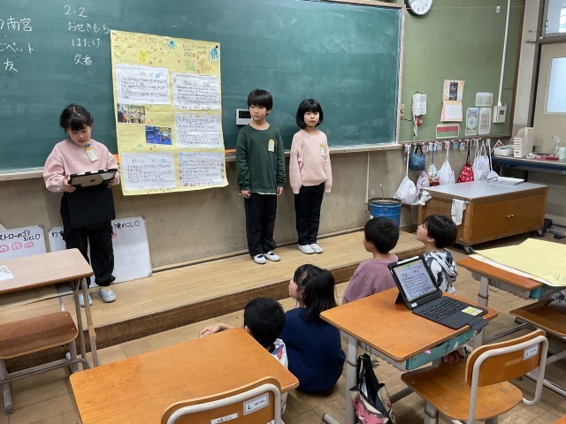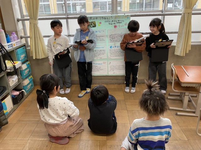 もっともっと町たんけんで調べた町の施設や場所について、新聞にまとめたものを発表する練習を1組、2組いっしょに行いました。