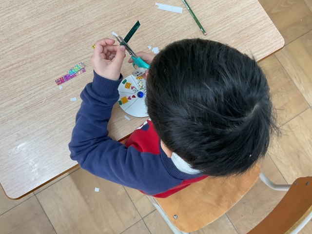 円形の型紙にキラキラテープを貼って飾り付けしました。