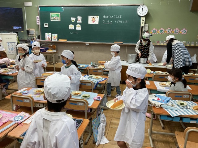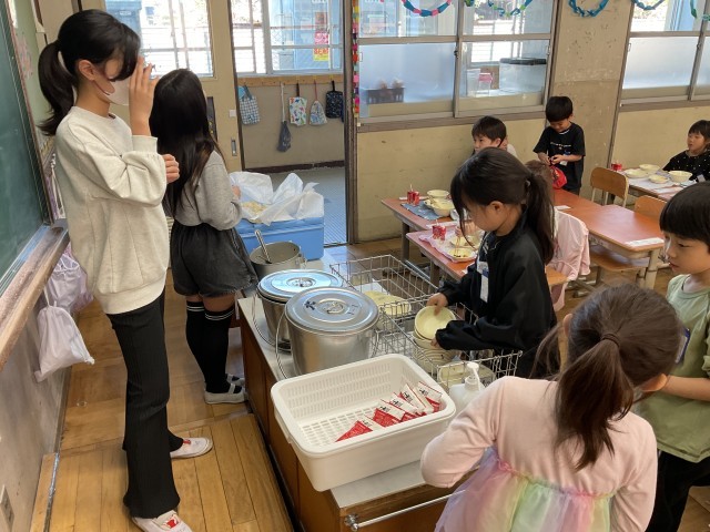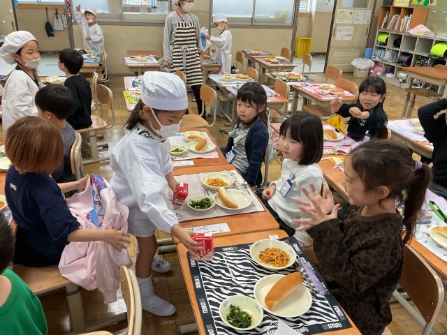 給食も始まり、6年生に手伝ってもらいながら一生懸命おかずを運びました。