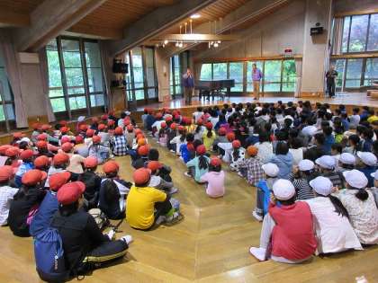 今朝の「朝の集い」は本館のオリエンテーションホールで行いました。
