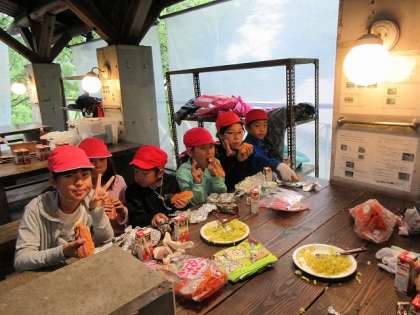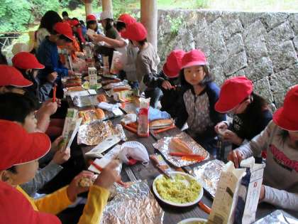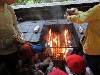 カレー味のキャベツ炒めやウインナーをはさんだホットドッグをアルミホイルで包み,牛乳パックに入れて燃やします。ほどよく温まって,山のおいしい空気とともに,いただきました。