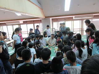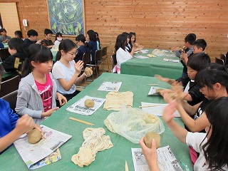朝から荷物の整理,部屋の掃除を行った後,午前中の活動「花背焼き」の体験をしました。まずはじめに師匠のお手本を見せてもらい,そのあとにお皿づくりをしました。