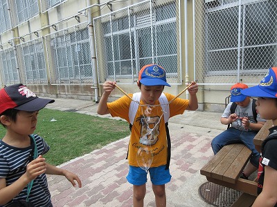 その他にも,うちわやバドミントンのラケット,紐など,いろいろな道具を使ってシャボン玉を飛ばして楽しみました。指で輪を作って飛ばしてみようと,何度も挑戦している様子も見られ,子どもの探究心のスイッチが入っているのを感じました。