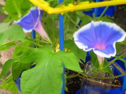 1年生が栽培している朝顔に、色とりどりの花が咲き始めました。