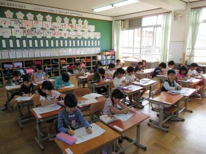 暑さがでてきた朝ですが,子ども達はきちんと席について色塗りや絵を描くことをやっています。