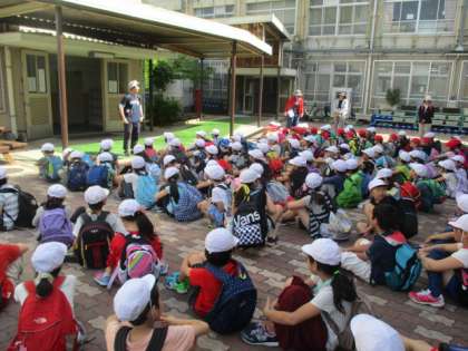 今日は、快晴で絶好の遠足日和となりました。1年生〜3年生・3組さんが、鳥羽離宮跡公園へ向けて出発しました。桂川の堤防を歩いて行きます。