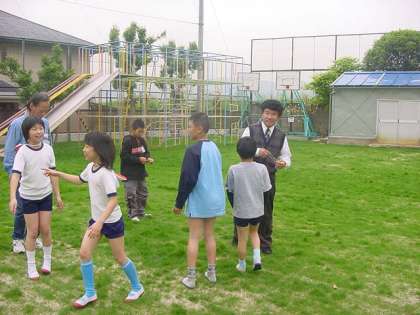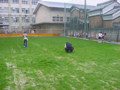 芝が少しずつ増えてきました。委員会活動に芝生・園芸委員会があったようです。平成16年4月28日に委員会の子ども達が芝生以外の雑草をぬいていました。こんな活動があったんですね。