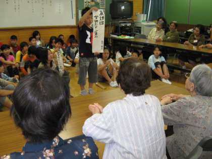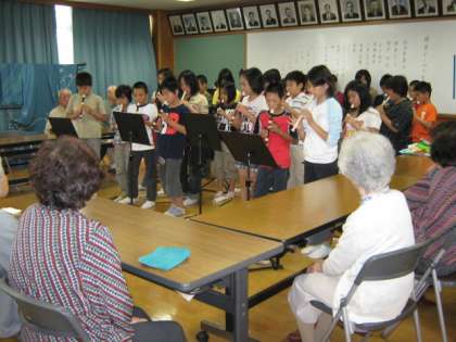 11時にふれあいサロンで地域のお年寄りの方と6年生が交流しました。リコーダーで演奏を聞いていただいたあとで自分の作った俳句を紹介しました。