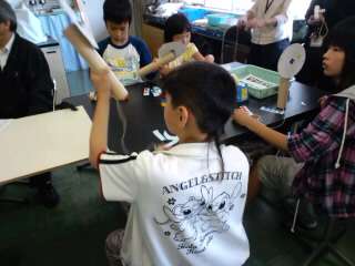 午前中に青少年科学センターで学習をしました。教室ではビュンビュンごま(写真)を作って遊んだり,展示コーナを見たり,プラネタリユムでくまのプーさんの案内で星の観察をしました。