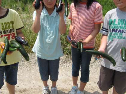 畑のナスときゅうりが大きくなってきたので今日は4年生が収穫しました。大きいナスときゅうりがとれました。