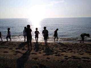 ホテルに到着しました。夕食までの間に海岸を散策しています。夕日がきれいですね。