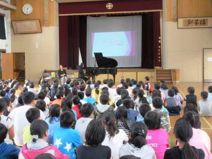 クラシックの名曲をはじめ,「さくら」等日本の歌のメドレー等も演奏してくださり,会場は美しいメロディと優しい音色に包まれました。また,子どもたちが歌う「パプリカ」を聴いたあと,即興で伴奏を付けて演奏され,グレースさんの美しいピアノに合わせて子どもたちが歌うという心温まる場面もありました。