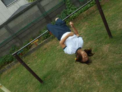鉄棒では,新しい技に挑戦しています。子どもたちのお気に入りは「こうもりふり」です。上手に体を揺らしています。