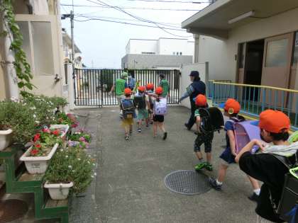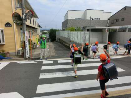 伏見警察署の方,地域の方にお世話になって,下校の時の交通安全のおさらいをしながら下校しました。6月に交通安全教室をしてくださった,伏見警察署の署員さんに,「横断歩道を渡るときは?」と聞かれ,「右左を見て渡るー!」と大きな声で答えていました。登下校だけでなく,道を歩く時は周りをよく見て安全に!