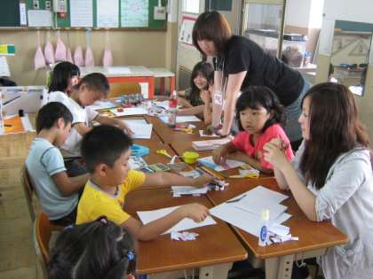 2校時は体育館で自己紹介のあとボール遊びをしました。(写真)3校時では紙芝居(こぶたのまーち)を見て印象に残った場面を思い思いに画用紙に書いていました。(写真)