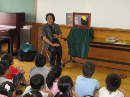 大石 進先生をお招きして本の読み聞かせをしていただきました。(3回目)今日は本だけではなくニャーオンという紙芝居もみせていただきました。紙芝居は日本だけにしかないことを知って子ども達はびっくりしていました。