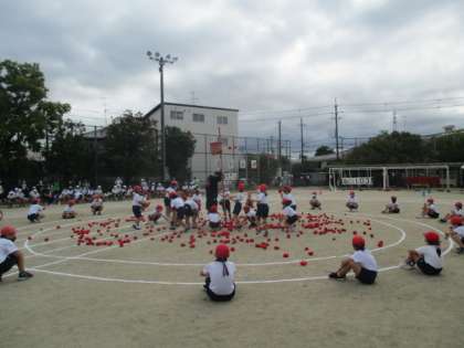 選択種目の玉入れの様子です。1回戦では,1年2年3年生は紅白同数となり,4年5年6生も紅白同数となる珍しい結果となり,再試合をしました。