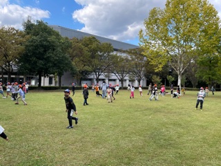 秋見つけをした後に、芝生広場でだるまさんが転んだをしています。沢山のどんぐりも集めました。
