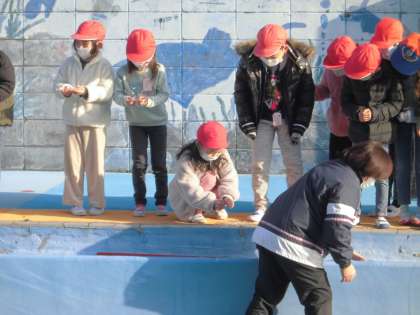 プールに氷がはったので,みんなで見に行きました。プール一面の氷に,歓声があがりました。一人ずつ先生から氷のかけらを渡してもらいました。「うわあ。きれい」「つめたい。」などと言いながらうれしそうでした。また,プールに向かって氷を投げると,割れた破片が氷の上を滑って広がり,きらきらときれいでした。毎日寒い日が続いていますが。ふゆと少し仲良くなれたひと時でした。