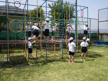 今日は体ジャンケンやまねっこウォークやフープくぐりなどを行いました。総合遊具にのぼって,手すりをしっかりともって3点支持も確かめました。