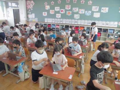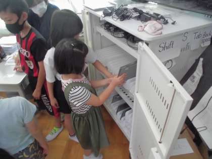 1年生は,タブレットをログインしてからデジタルドリルに取組みました。初めての体験でしたが5年生に教えてもらいながら取り組むことができました。