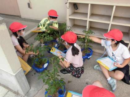 子どもたちは,「花が咲いてる。」「星の形みたい」「トマトの赤ちゃんみたいな小さな実がができてるよ」などとたくさんの発見をしながら絵や文で記録をかいています。実や葉の数を数えたり,算数で学習したものさしを使って背の高さを測ったりもしました。