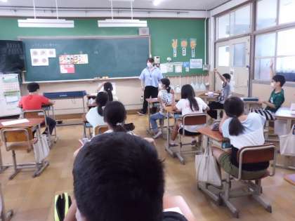 「バランスのよい食事」について学習に取組みました。栄養教諭の先生から体の成長に大切な主食,主菜,副菜,汁物の大切さをを教えていただきました。その後,自分たちで考えたバランスのよいメニューを考えました。
