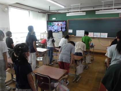 7月22日(金)、1学期終業式をオンラインで行いました。はじめに校長先生から全校児童へ応援メッセージをおくっていただきました。「できるよ。がんばれるよ。」学校でできるようになったことはお家でもがんばれるはずです。長い夏休みです。生活リズムを整えて、勉強する時間、掃除する時間、自由時間など、自分の生活スケジュールを立ててがんばってほしいと思います。