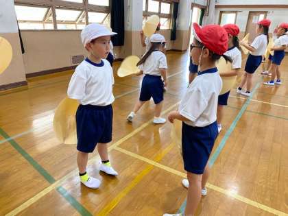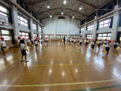運動会に向けて各学年で練習していた花笠音頭ですが、今日は1・2年生合同で練習しました。2年生が1年生に教える場面も見られました。体育館には元気な掛け声が響いています。