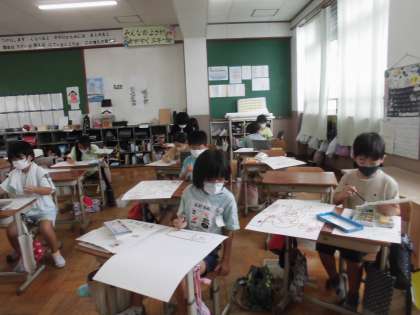 先週は、自分の描きたい場面を決めました。今週は下絵にしたり、着色したりとしていました。