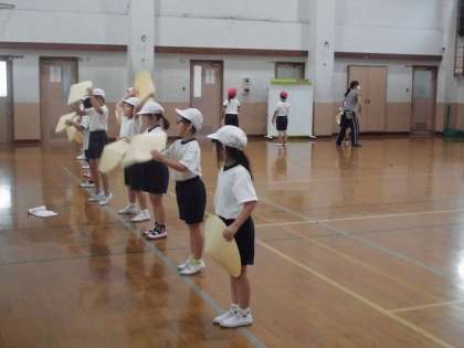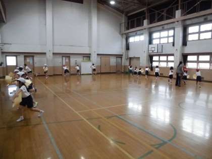 2年生では、花笠音頭の踊りも少し覚えてきたので、体育館で踊りました。1年生に上手に教えてあげるためにも、一生懸命練習しています。