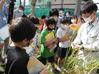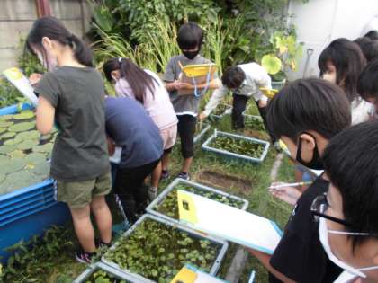 ビオトープにも秋の訪れを感じます。様々な植物が,実や種をつけ始めています。子どもたちは,さすてな京都やアドプランツのスタッフの方々と共に,熱心に観察をしていました。