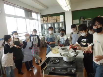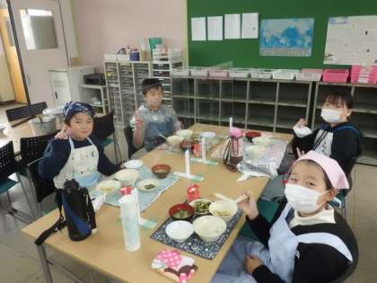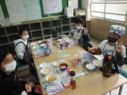 みんなでおいしくいただきました。自分たちで作ったみそ汁は,とてもおいしくてお代わりに行列ができていました。