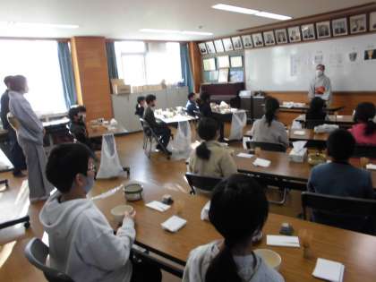 12月6日(火)に、茶道教室が開かれました。裏千家の先生方から、茶道を習いました。友禅染体験に引き続き、とても貴重な体験となりました。一服の茶を通じて、もてなす側ともてなされる側がいて、両者が心を通わせ合う時間と空間を共有するという茶道の良さを味わった子どもたちでした。