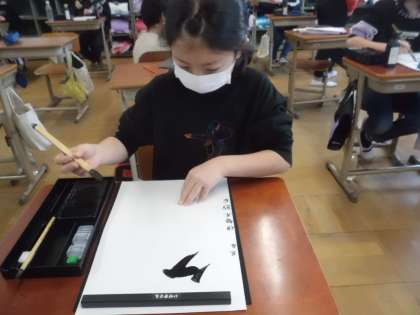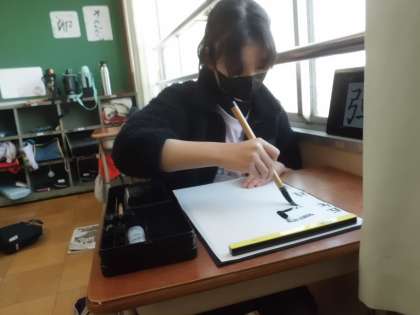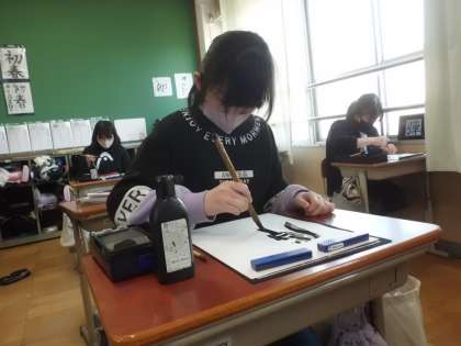 3学期はじめての書写の学習は、漢字一文字で表現しました。それぞれが選んだ漢字には、願いや思いがあります。平和な世界になってほしい。楽しむ一年にしたい。などの理由を交流しながら取り組みました。