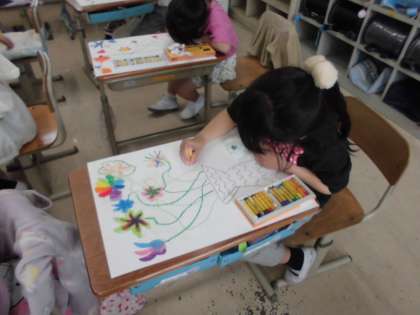 2年生の学習が始まりました。みんな,はりきって学習しています。今日は,はじめての図画工作の学習でした。クレパスを使って,自分だけのふしぎな花をかきました。とってもすてきなお花がたくさんかけました。