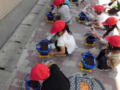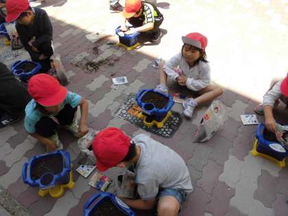 子どもたちはふかふかの土のベッドを作って、アサガオの種を蒔いていました。