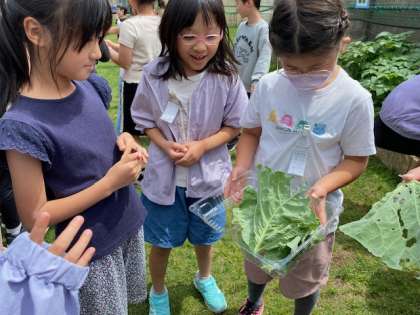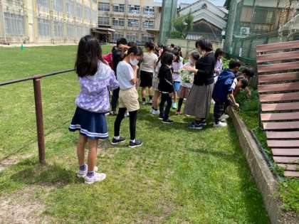昨年の3年生が植えておいてくれた花壇のキャベツに青虫がやってきてきました。教室で観察のために育てています。今朝はさなぎになっていて、子どもたちが一生懸命観察していました。