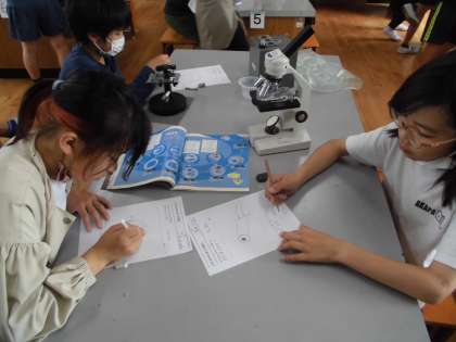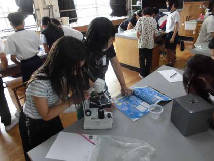 理科のメダカのたんじょうの学習で,メダカのたまごを顕微鏡で観察しました。たまごのまわりに細かい毛やとげのようなものがあったり、目ができてきたりしていました。小さな命も大切にしてほしいと思います。