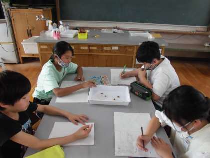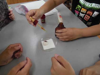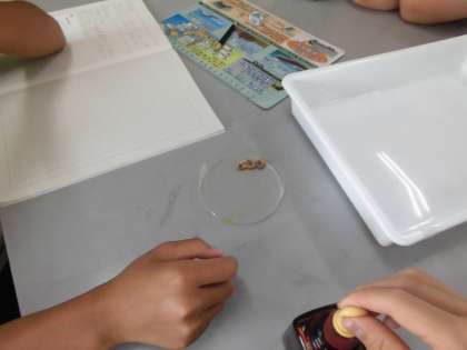 理科の植物の発芽と成長の学習で、種子には発芽に必要な養分があるのかどうかを調べました。ヨウ素液を使って、デンプンがあるのかを確かめました。色の変化に驚きの声があがりました。