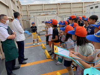 お肉をパックする機会を見せていただきました。パックを置くだけで、あっという間にラップをして、ラベルを貼って出てくる機会に歓声が上がっていました。最後の質問タイムでは子どもたちのインタビューにたくさん答えていただきました。