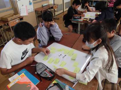 国語の「よりよい学校生活のために」で話し合いをしていきます。話し合いの仕方や意見が対立した時にはどうすればよいかを学習しました。教科書の例をもとに、意見を出し合い、内容を整理していきました。これからも、相手の話をよく聞き、話し合いを進めていきたいです。